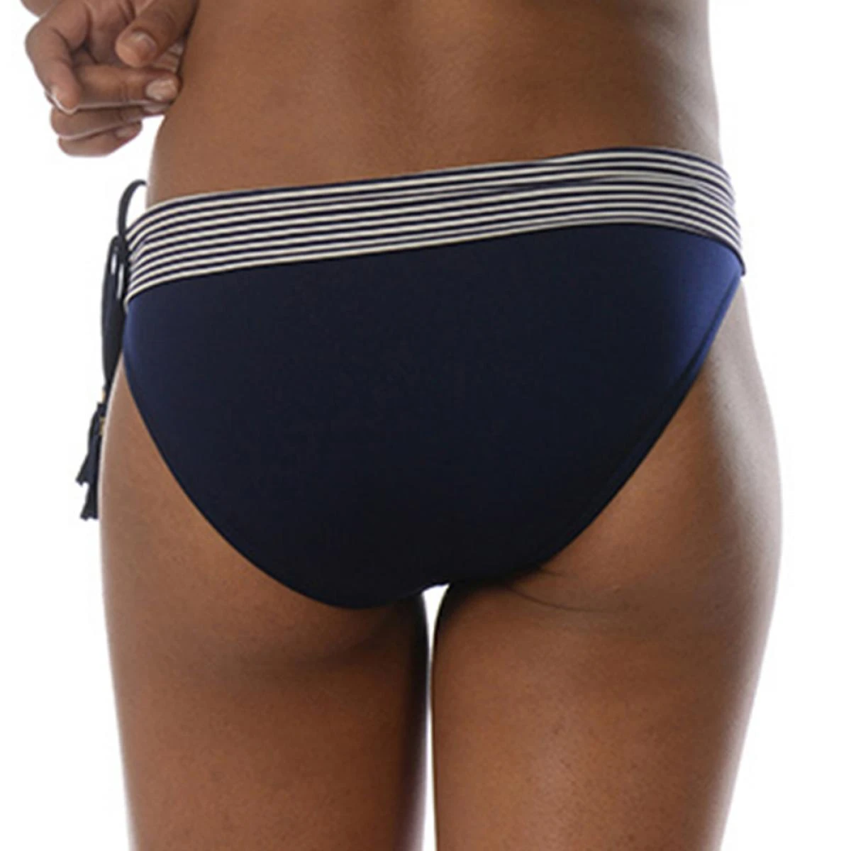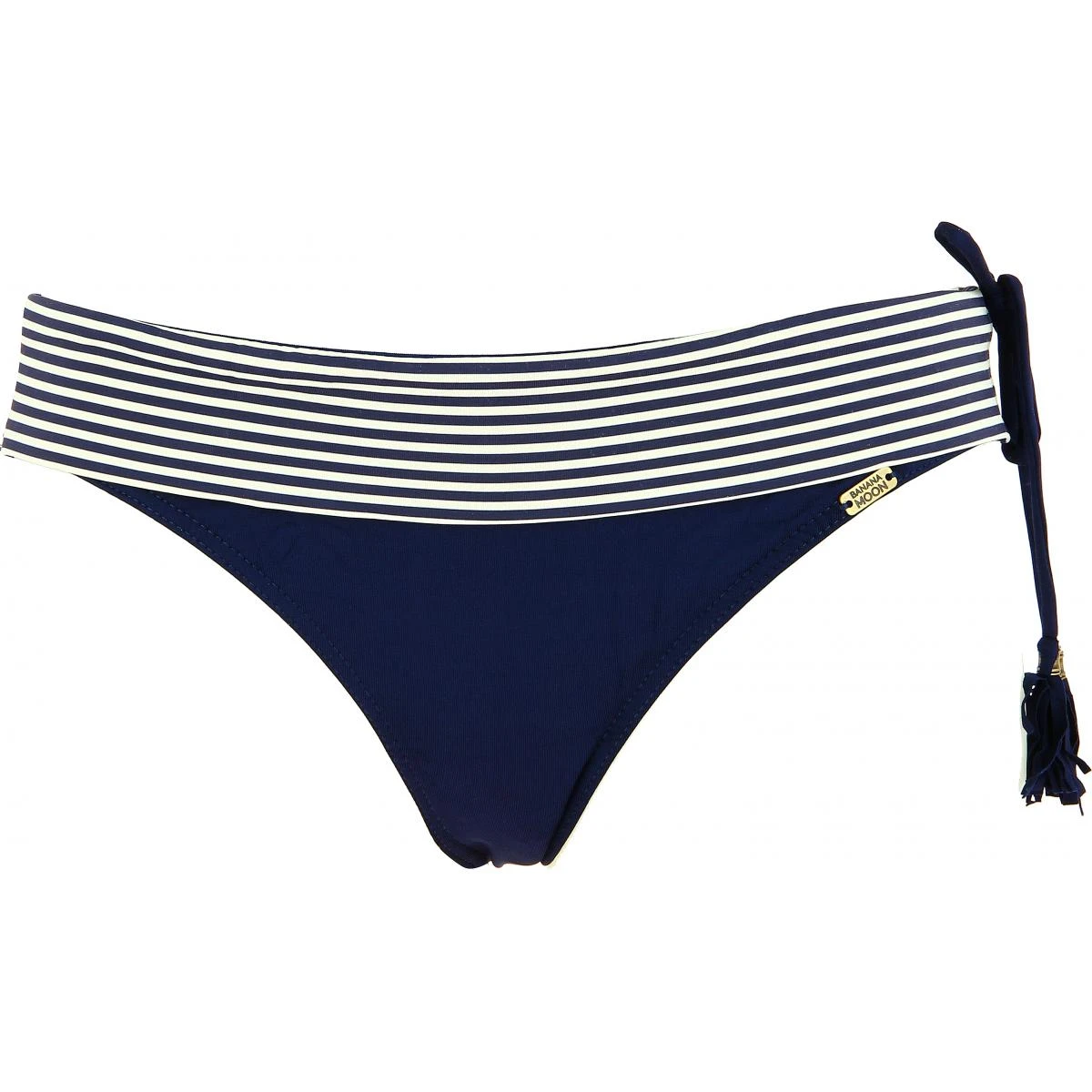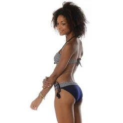 Sur le côté gauche de ce bas de maillot au niveau des hanches, on trouve deux lanières bleu marine desquelles pendent deux pompons habillés d’un petit bijou doré qui sublime le bleu marine et le met en valeur.