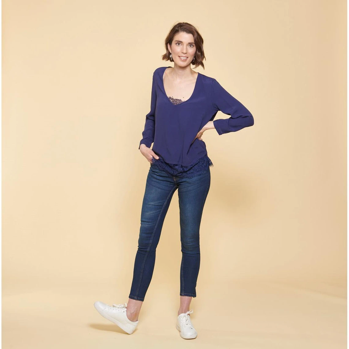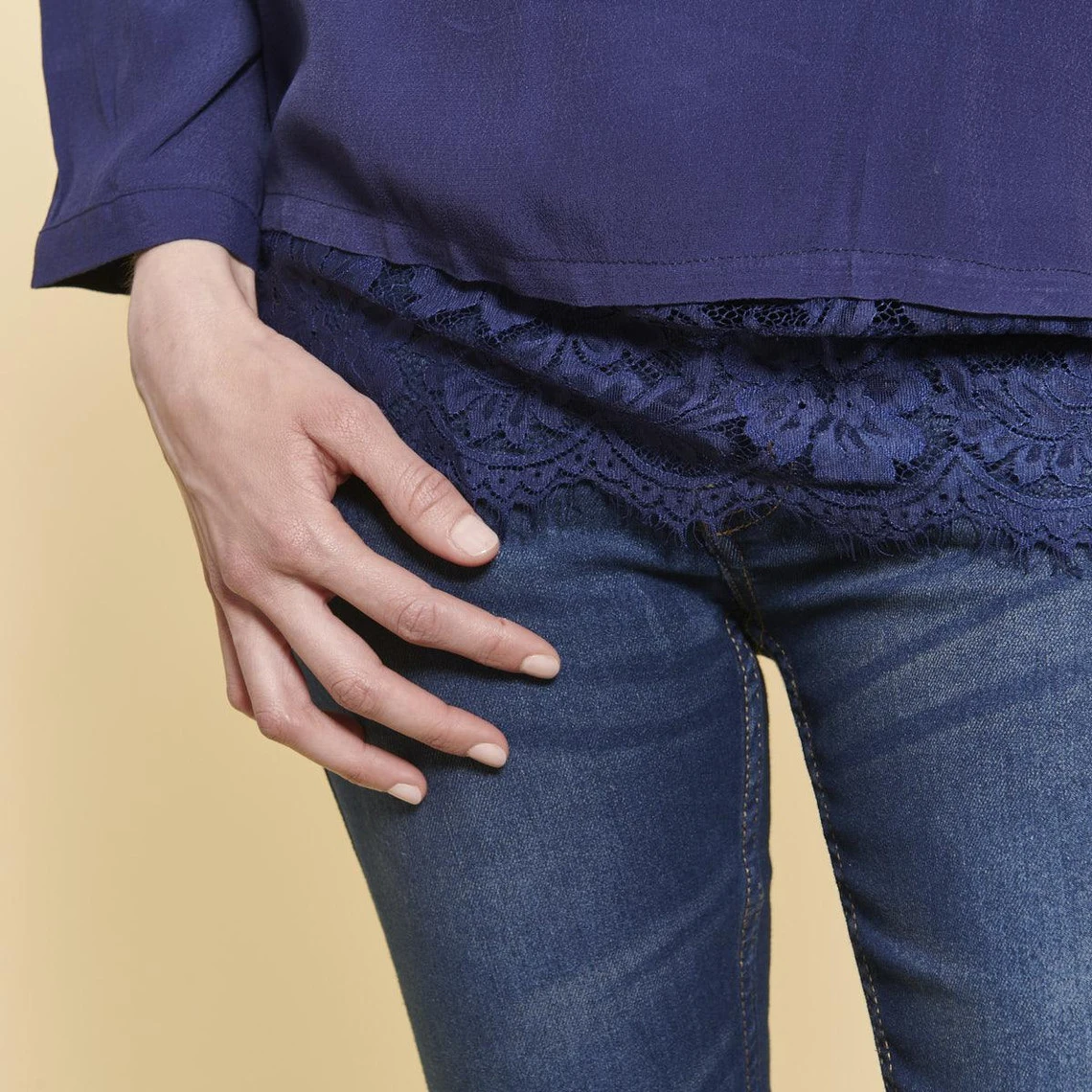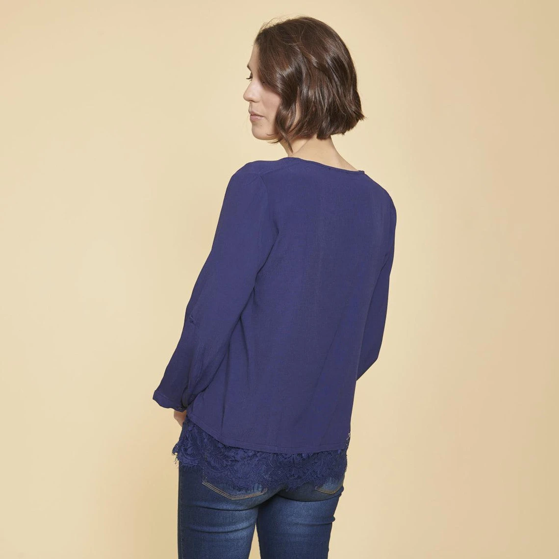 Blouse manches longues avec application de dentelle au bas, décolleté en V avec détail dentelle.
