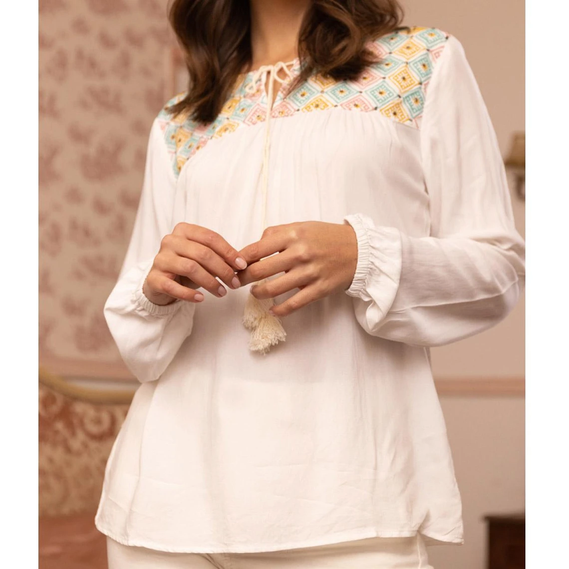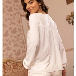 Blouse manches longues élastiquées fronces et broderie femme
