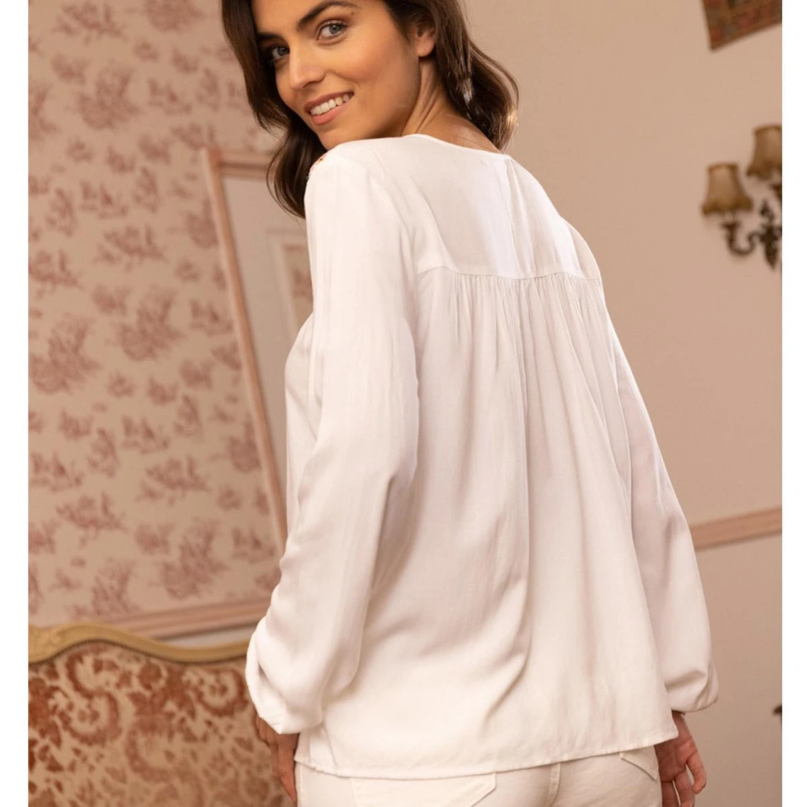 COMPOSITION, article blouse manches longues élastiquées fronces et broderie femme :