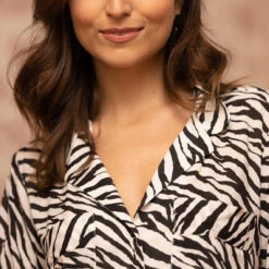 Le motif star de cette saison ? L’imprimé zèbre ! Déjà indispensable en 1988, le zébré fait son grand retour et nous le verrons partout. Vous avez envie de succomber à la tendance ? Alors craquez sans tarder pour notre ravissant chemiser à manche courte entièrement fabriqué en France. On craque complétement pour sa coupe droite et structurée et pour ses ravissants détails. Poches sur la poitrine, fermeture à bouton noir, décolleté et col à revers.
