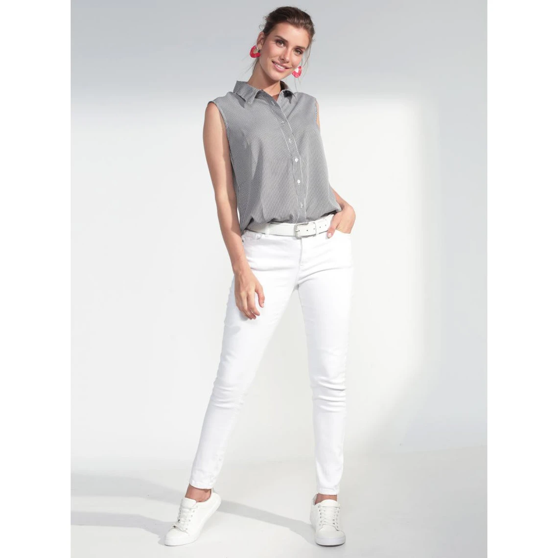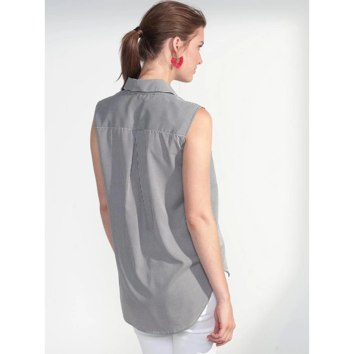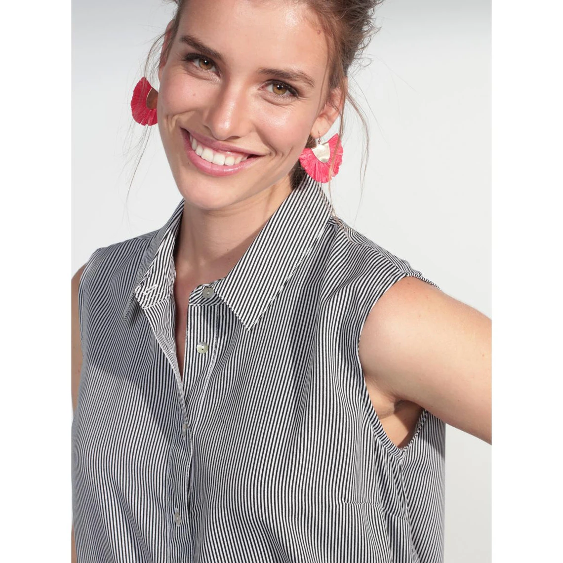 Corsage sans manche totalement imprimé. Fines rayures verticales qui allongent la silhouette. Sans manches Col chemisier Fermeture par boutons Pinces sur poitrine Empiècement dos Pli au milieu