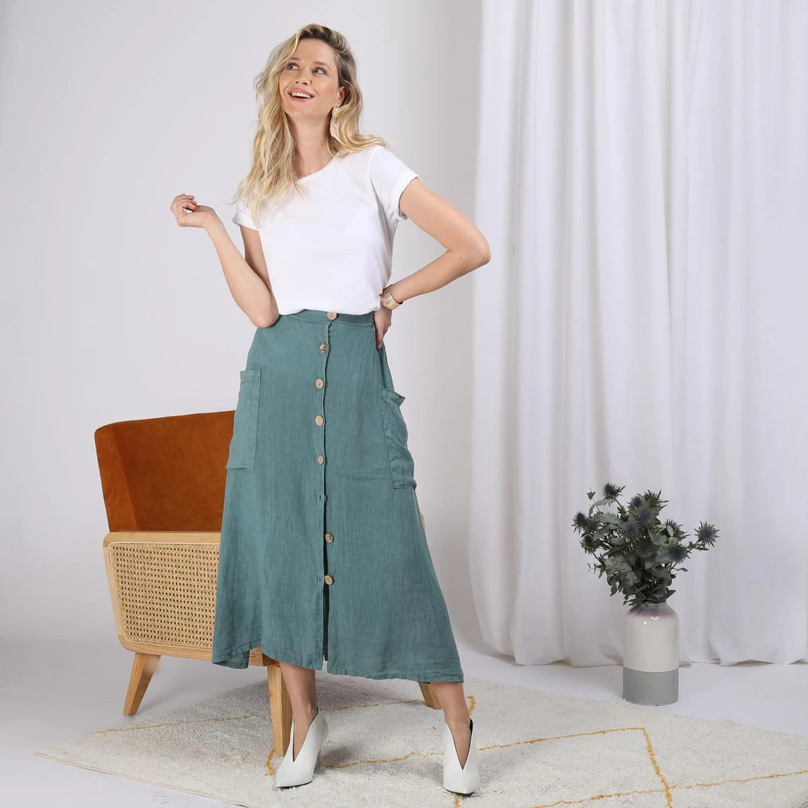 Jupe mi longue en lin, boutonnée devant, taille élastiquée dos.