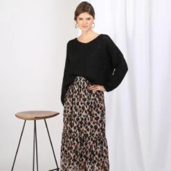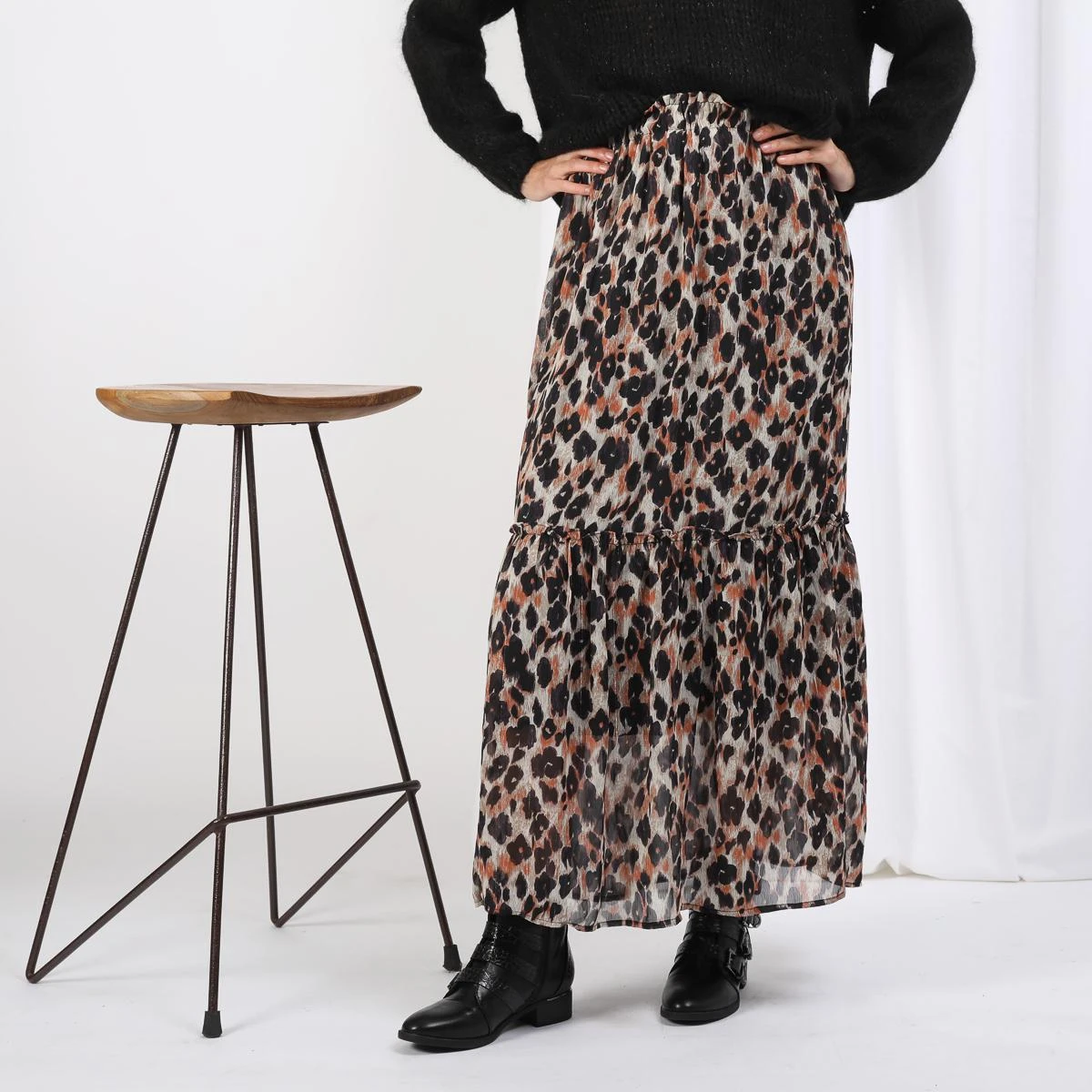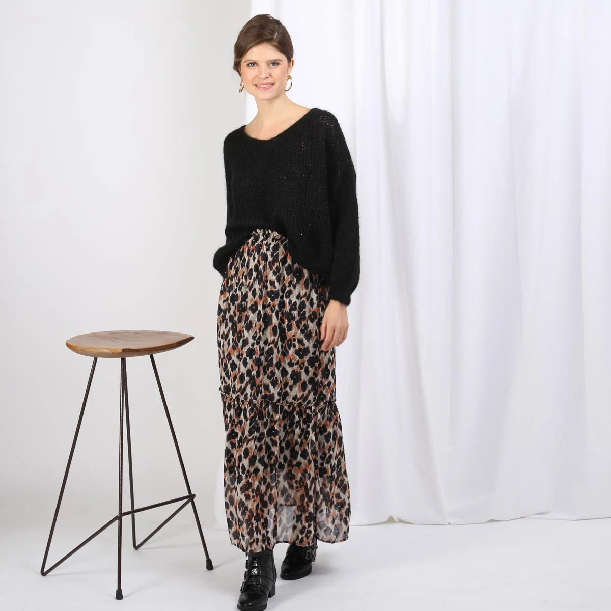 Jupe longue, imprimé léopard, évasée sur le bas. Maya mesure 1m75.