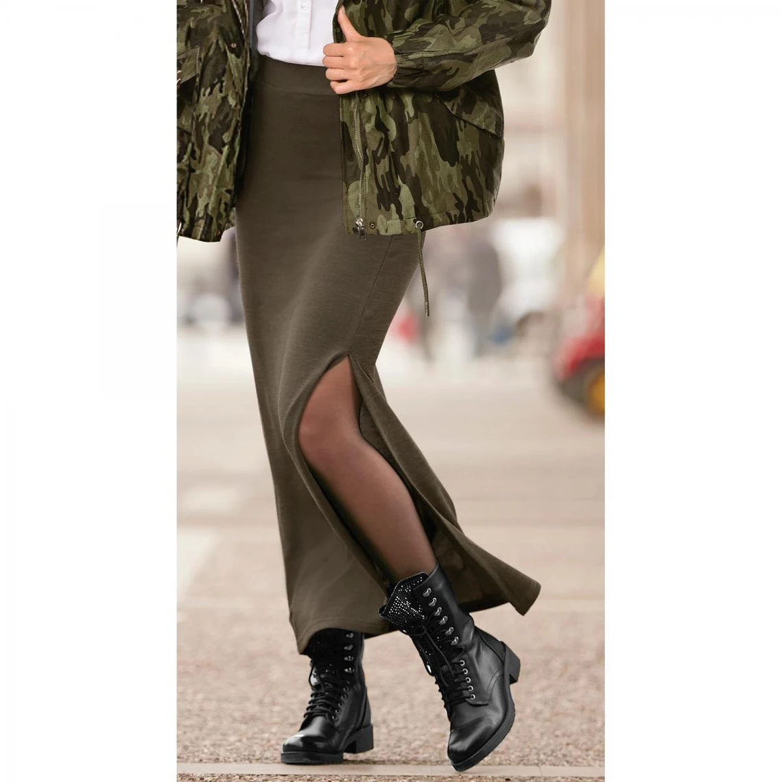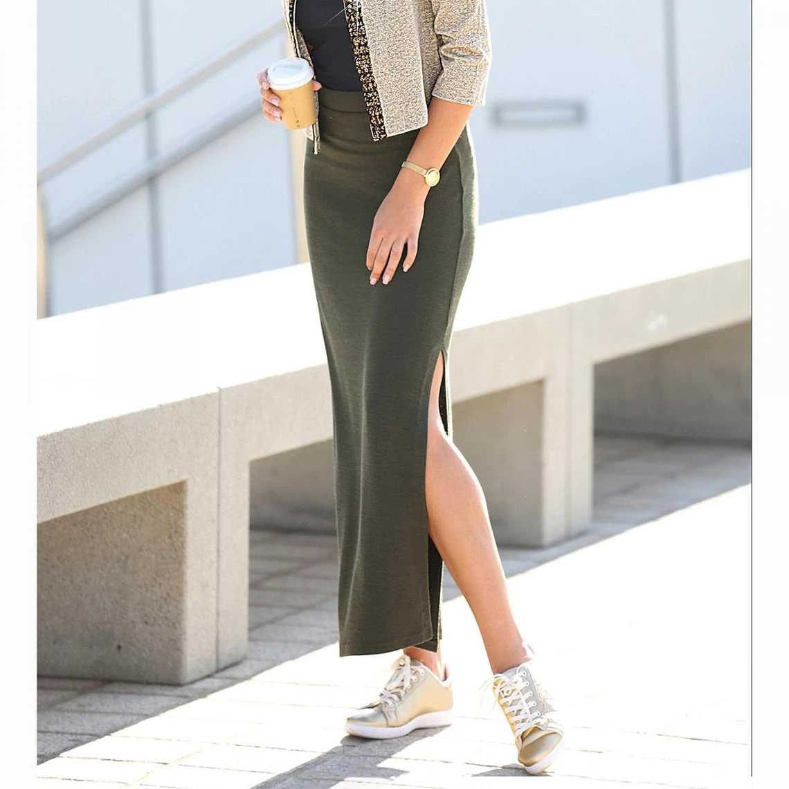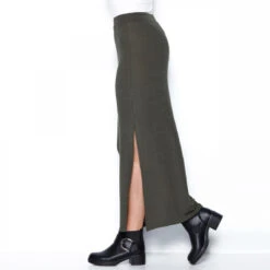 Jupe longue. Taille élastique. Fendue sur un côté. Maille jersey élastique. Longueur 95 cm environ.