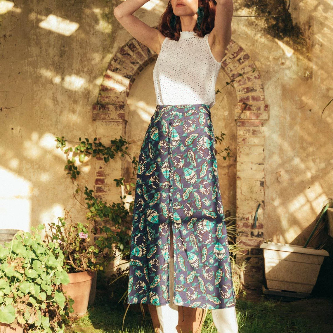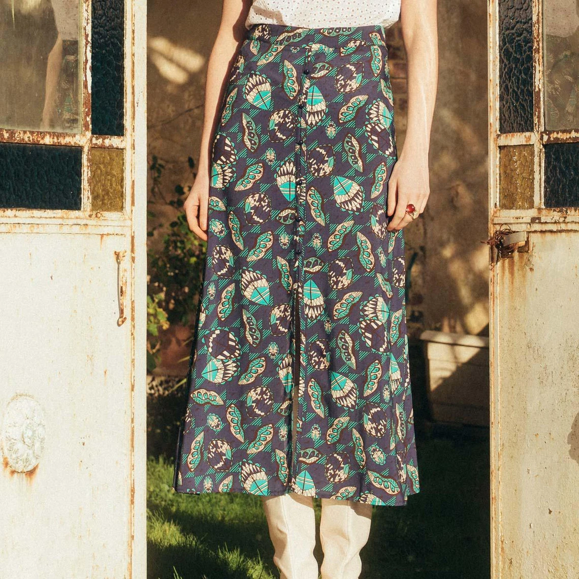 Jupe midi, boutonnée devant, en viscose imprimée.
