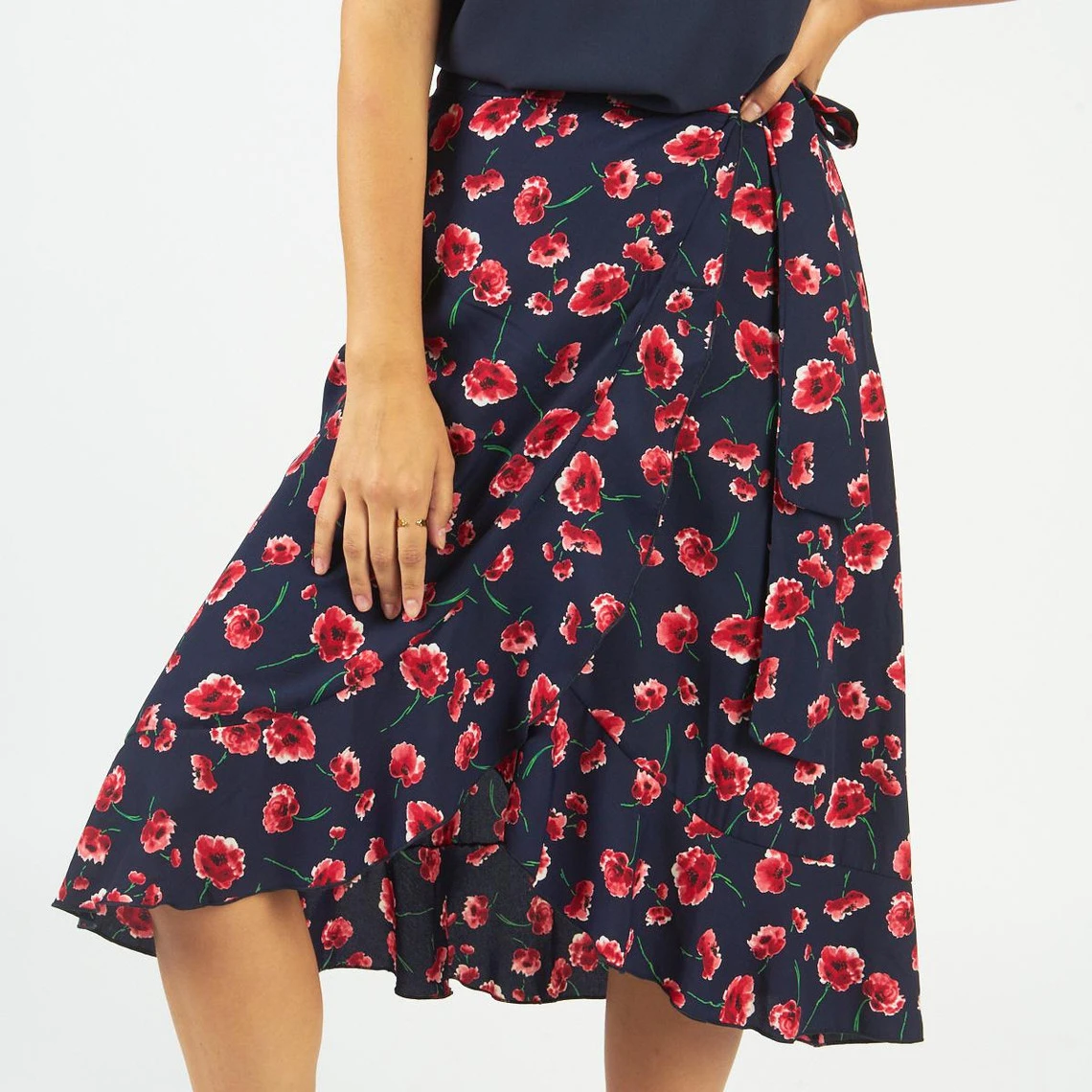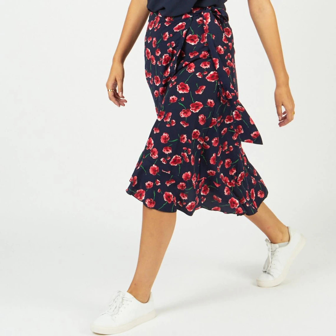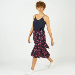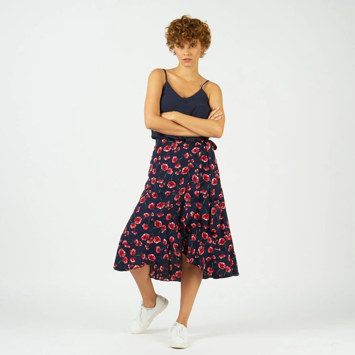 Jupe longueur midi, portefeuille imprimée et évasée. Maya mesure 1m75.