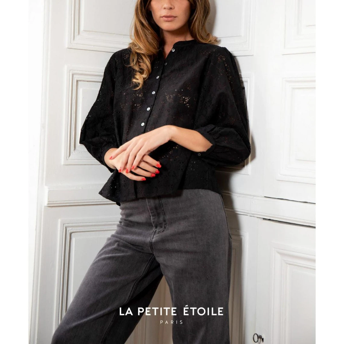 Décorée de dentelle fleurie, cette Blouse Cometa noire à manches ¾ ne peut que vous séduire. Elle est en plus embellie par ses fronces.