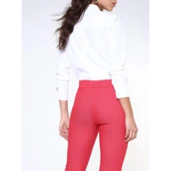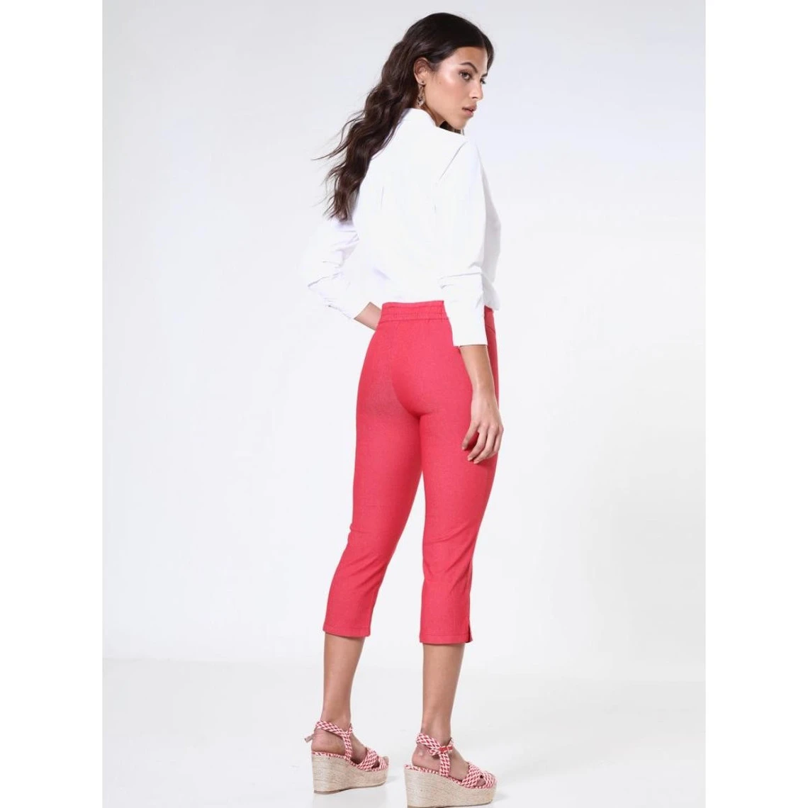 Pantalon corsaire. Fermeture par zip latéral invisible. Empiècement devant effet ventre plat. Élastique dos. Longueur entrejambe 52 cm, largeur bas 18 cm.