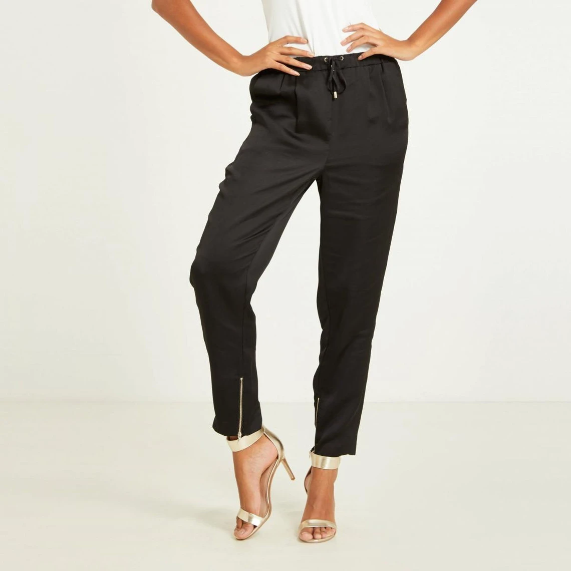 Pantalon fuselé avec zips chevillesCoupe fuselée, Fermeture zippée aux chevilles côté intérieurCordon à nouer pour ajuster la taille2 poches latérales Le mannequin mesure 1m75 et porte une taille S.Nom : 181-PETIS.N