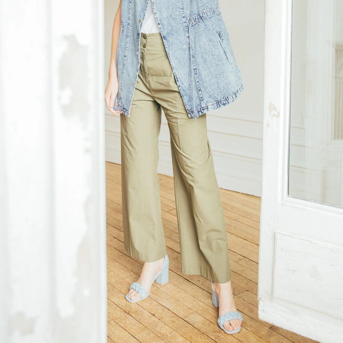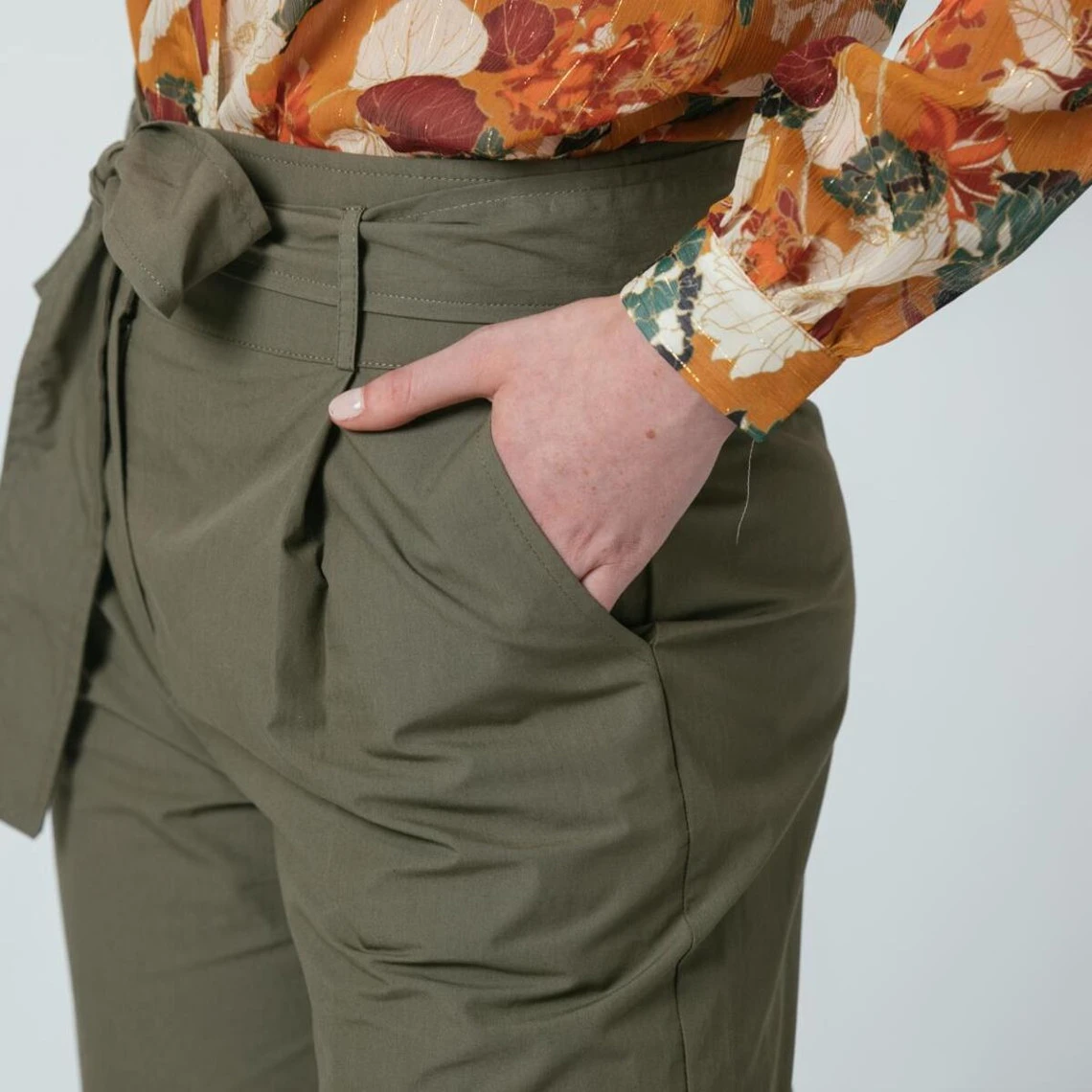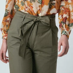 Pantalon paperbag en popeline de coton, ceinture en tissu à nouer.