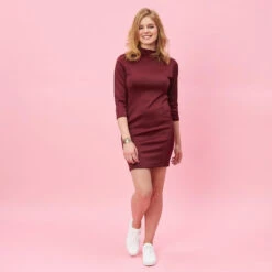 Robe. Col montant. Manches 3/4. Fermeture éclair invisible dans le dos. Cintrée. En néoprène. Longueur 90 cm environ.