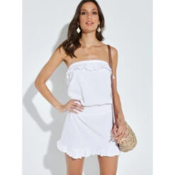 Décolleté parole d’honneur élastique Épaules dénudées Volant autour du décolleté Empiècement élastique en nid d’abeille à la taille Bas droit avec volant Point de jersey tout en douceur 100 % co