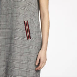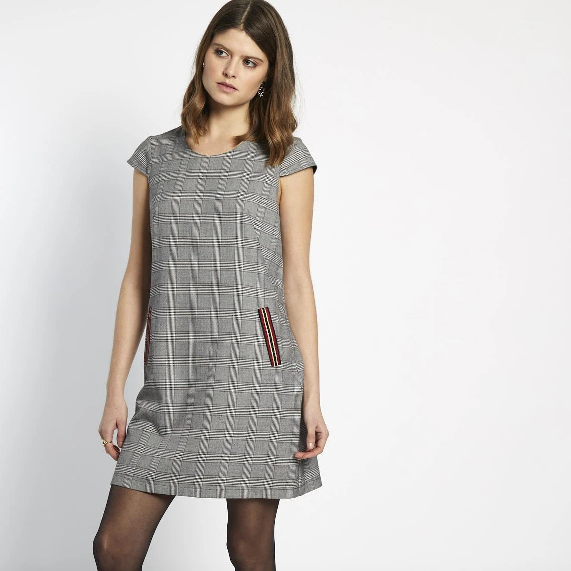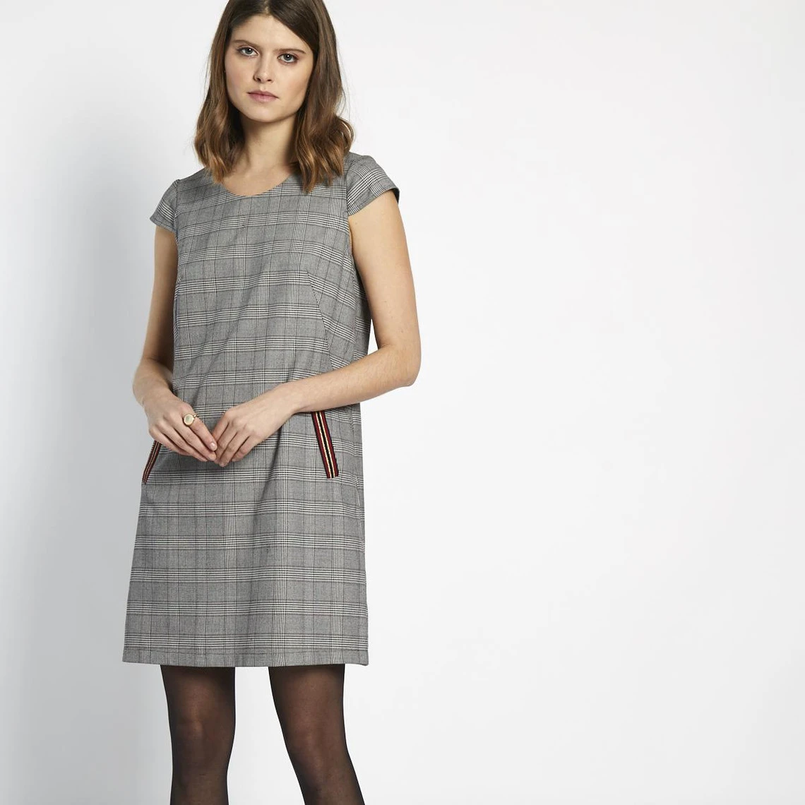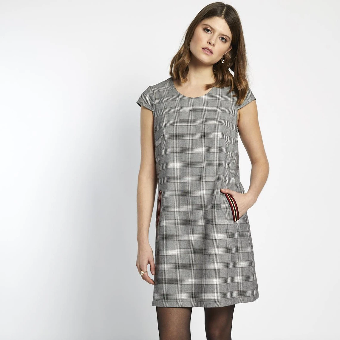 Robe à imprimés carreaux, longueur mi-cuisse, col rond et poches décorées de bandes. Gabriela mesure 1m76.