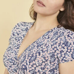 Robe manches courtes effet portefeuille, drapée sur le coté, décolleté en V.