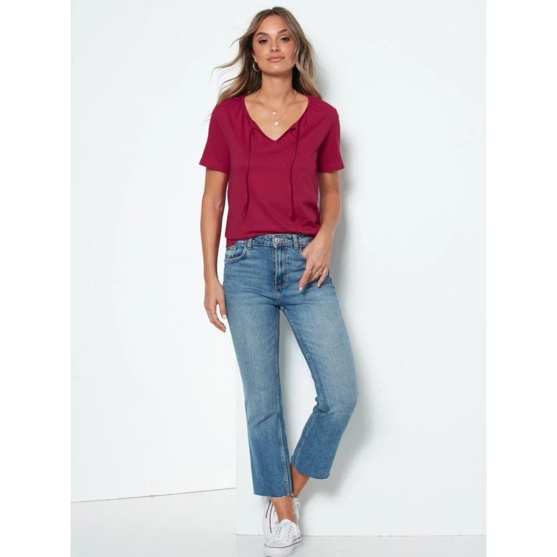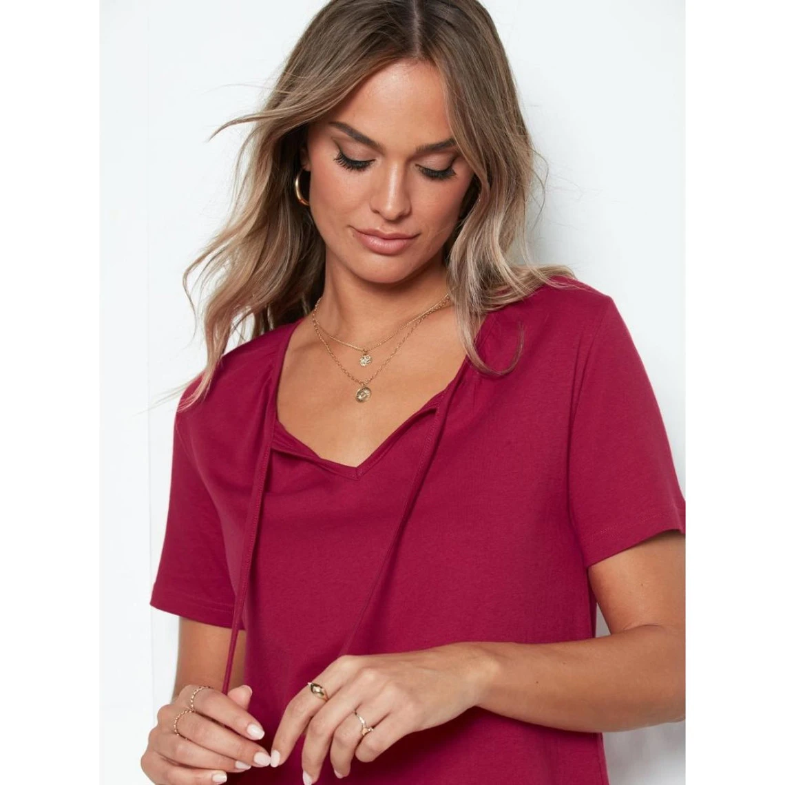 T-shirt à manches courtes de couleur unie avec encolure arrondie féminine avec détails froncés et ouverture en V avec cordons à nouer à votre guise. Encolure arrondie Rassemblement autour de l’enco