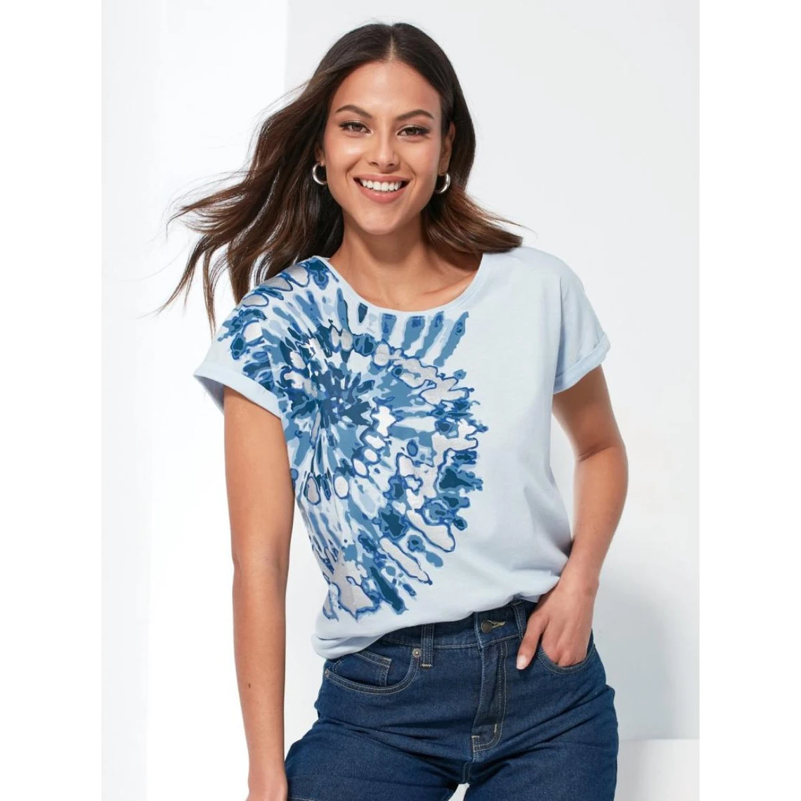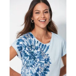 Décolleté en V Vif dans l’encolure Manches courtes Retournement au bord de la manche Bas droit. Impression positionnelle originale sur le devant Détails métallisés argentés Point de jersey tout