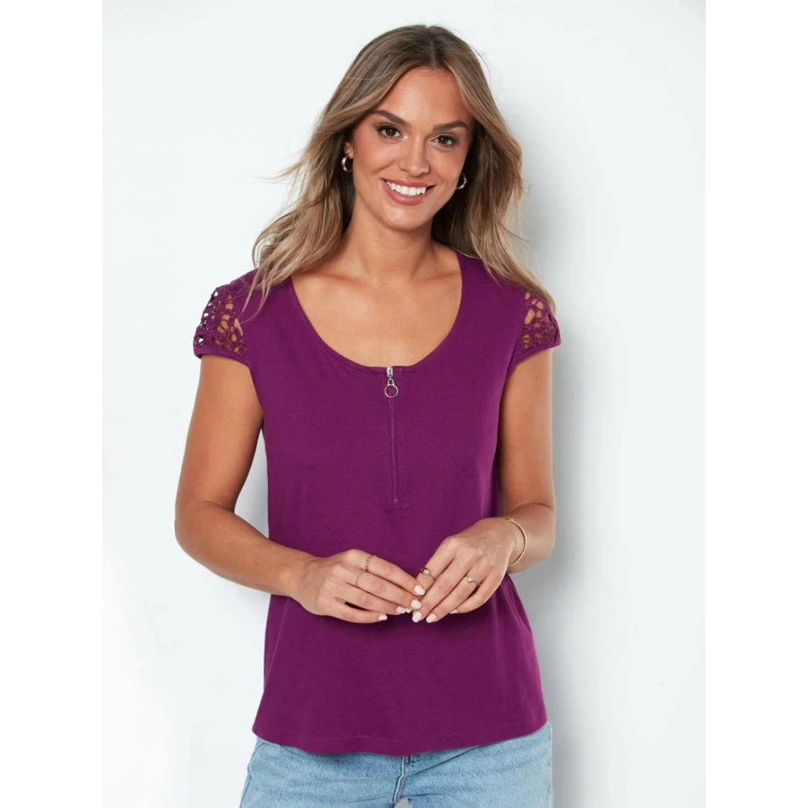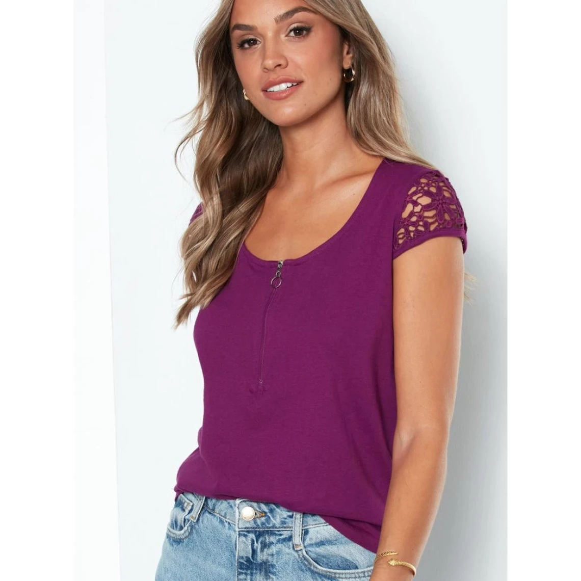 Encolure arrondie Fermeture éclair sur le devant Manches courtes Manche en dentelle Bas droit Point de jersey tout en douceur 100 % coton. ongueur : 64 cm environ (Traduction Automatique)