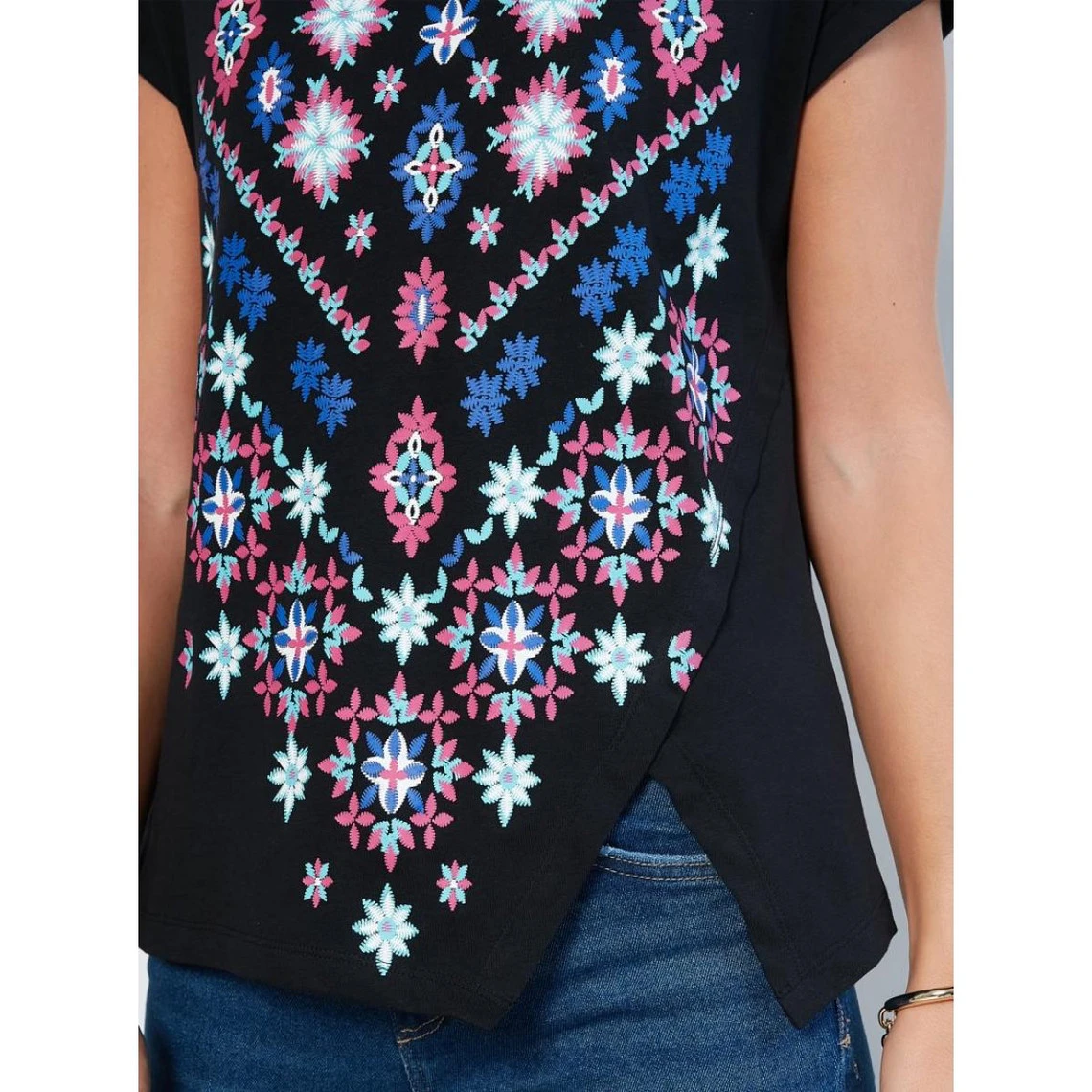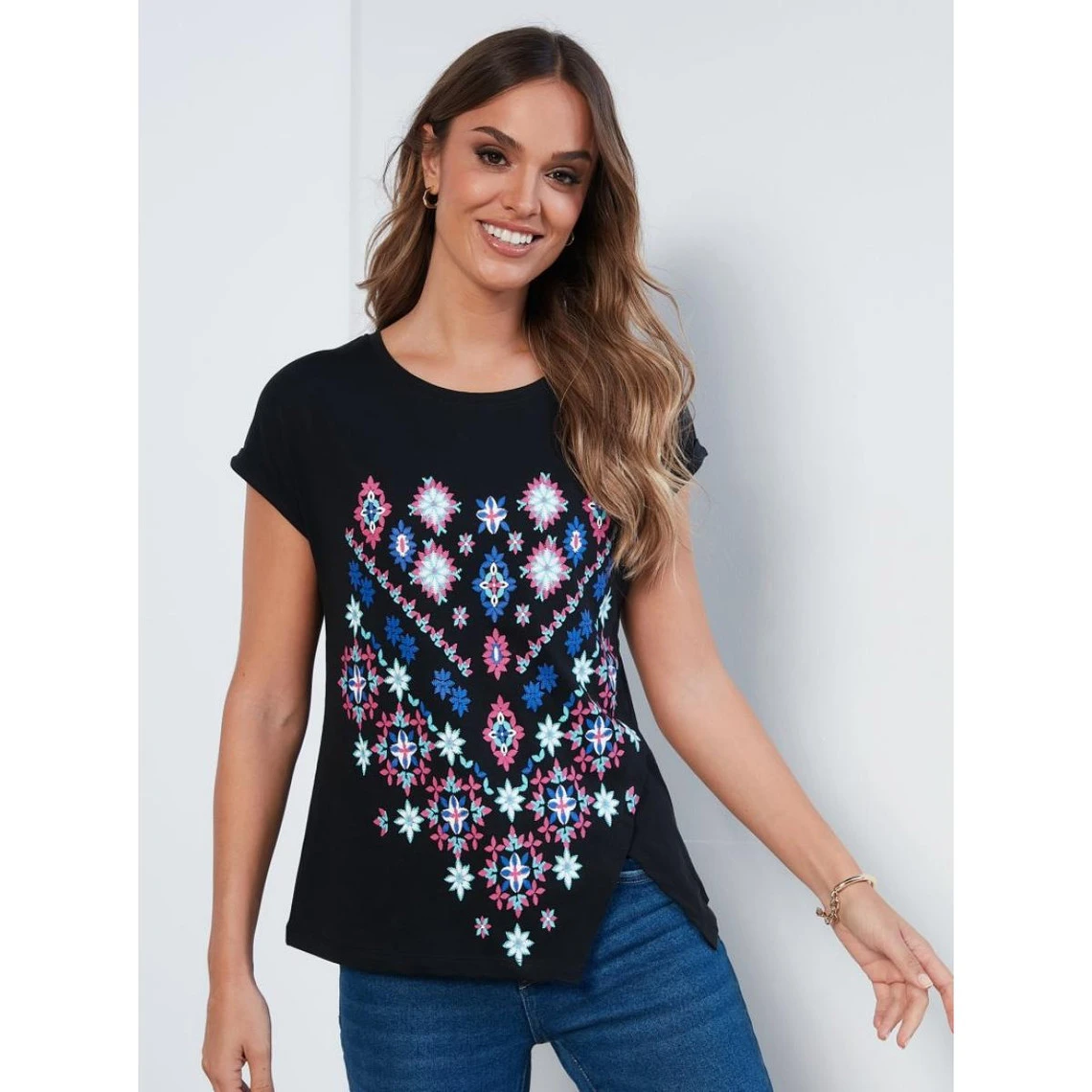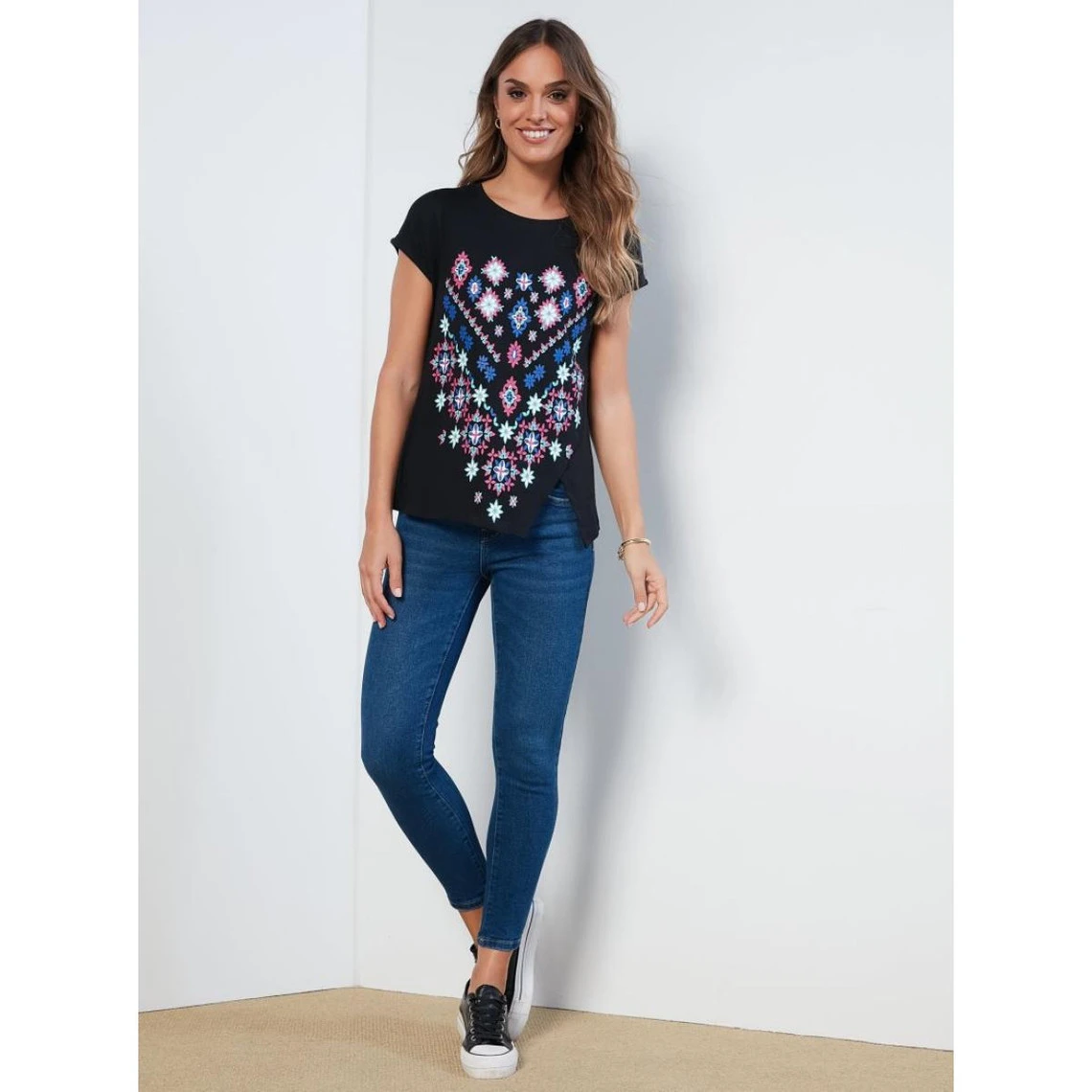 Ce tee-shirt Ă manches courtes, imprimĂ© de motifs multicolores lumineux sur le devant, est idĂ©al pour mettre en valeur votre silhouette avec sa coupe diagonale d’un cĂ´tĂ© et son ourlet asymĂ©trique qui allonge visuellement la silhouette.