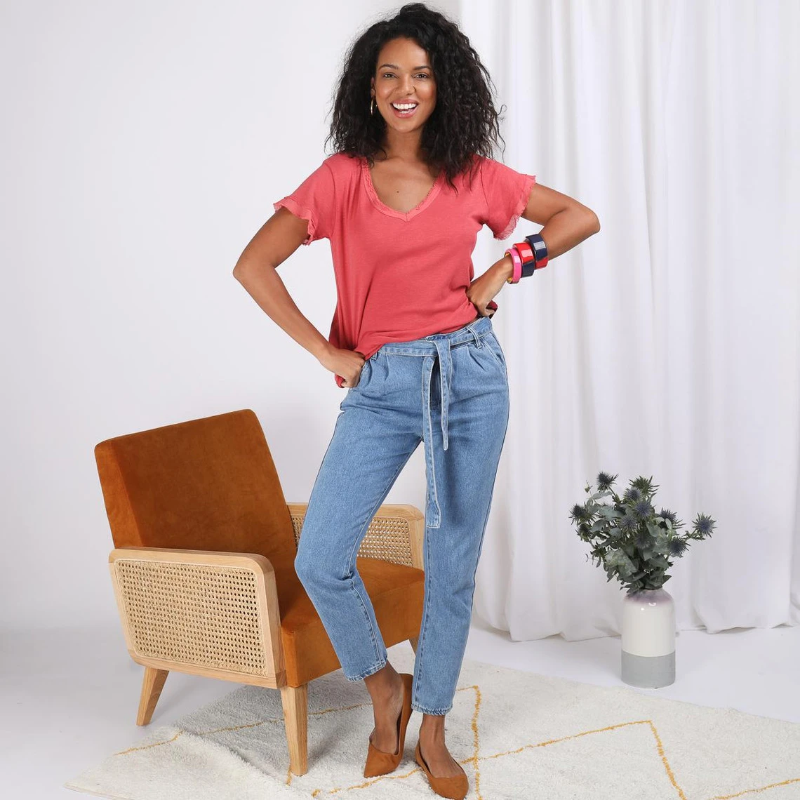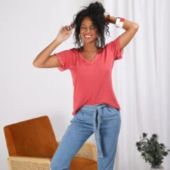 Tee-shirt manches courtes col V, dĂ©tail de franges Ă l’encolure et aux manches.Â