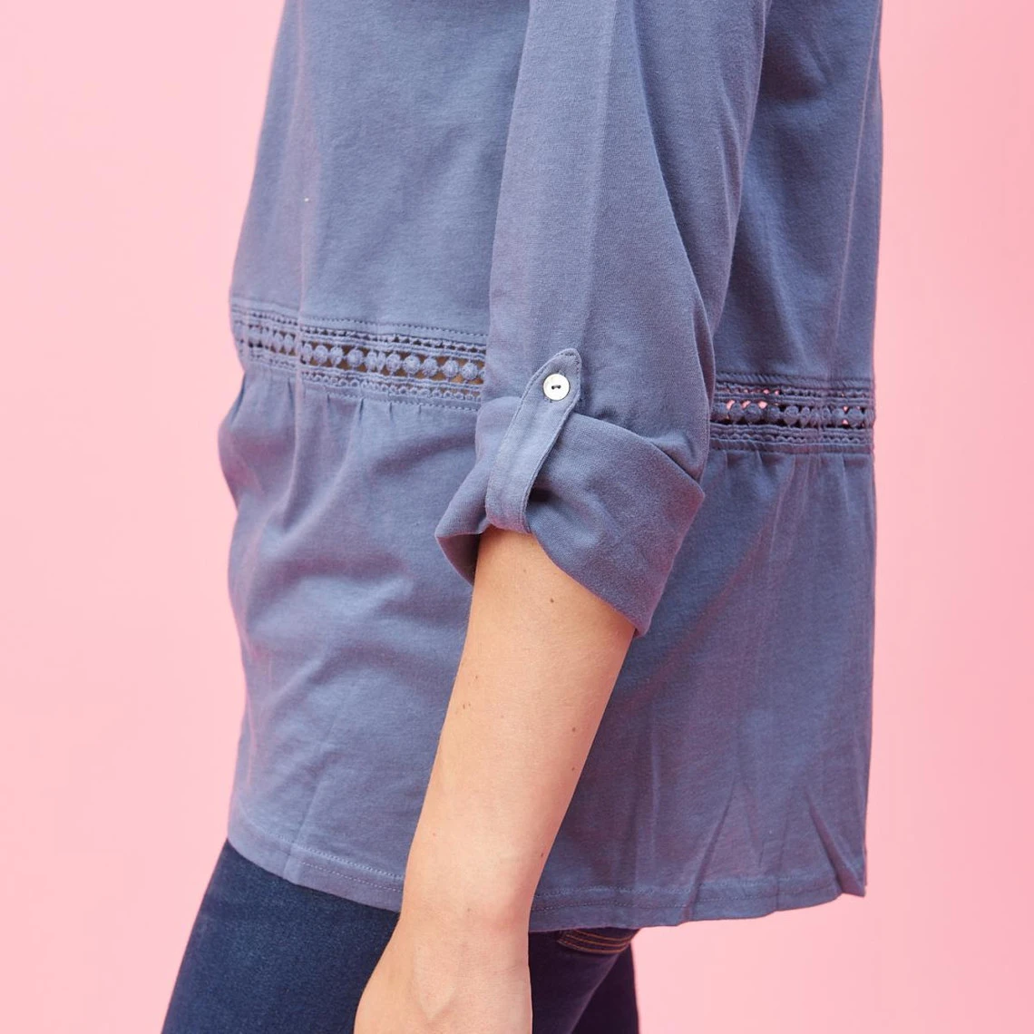 Tee-shirt manches longues ajustables dentelle et fronces femme