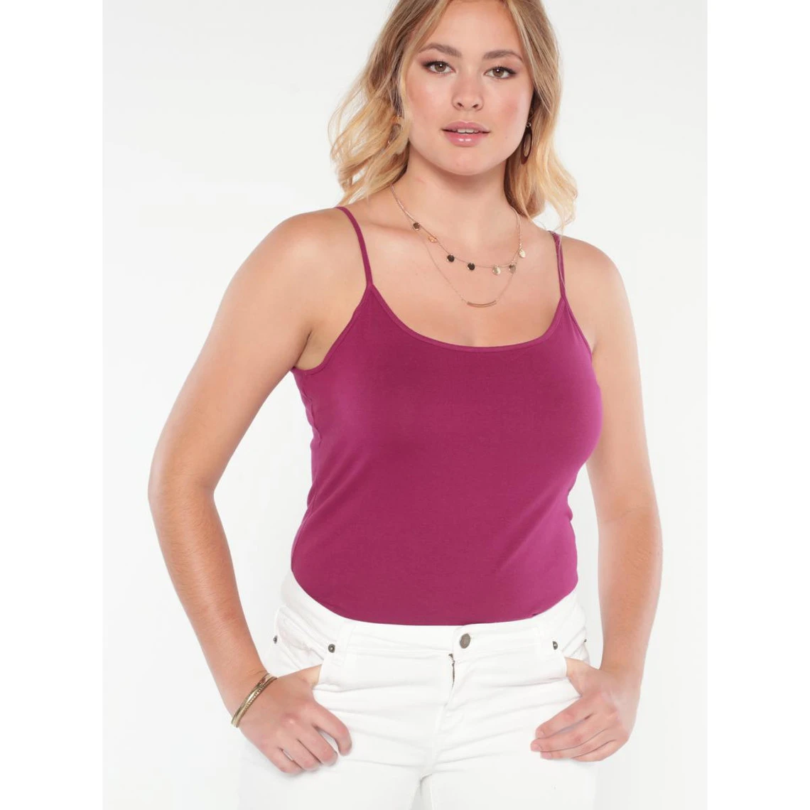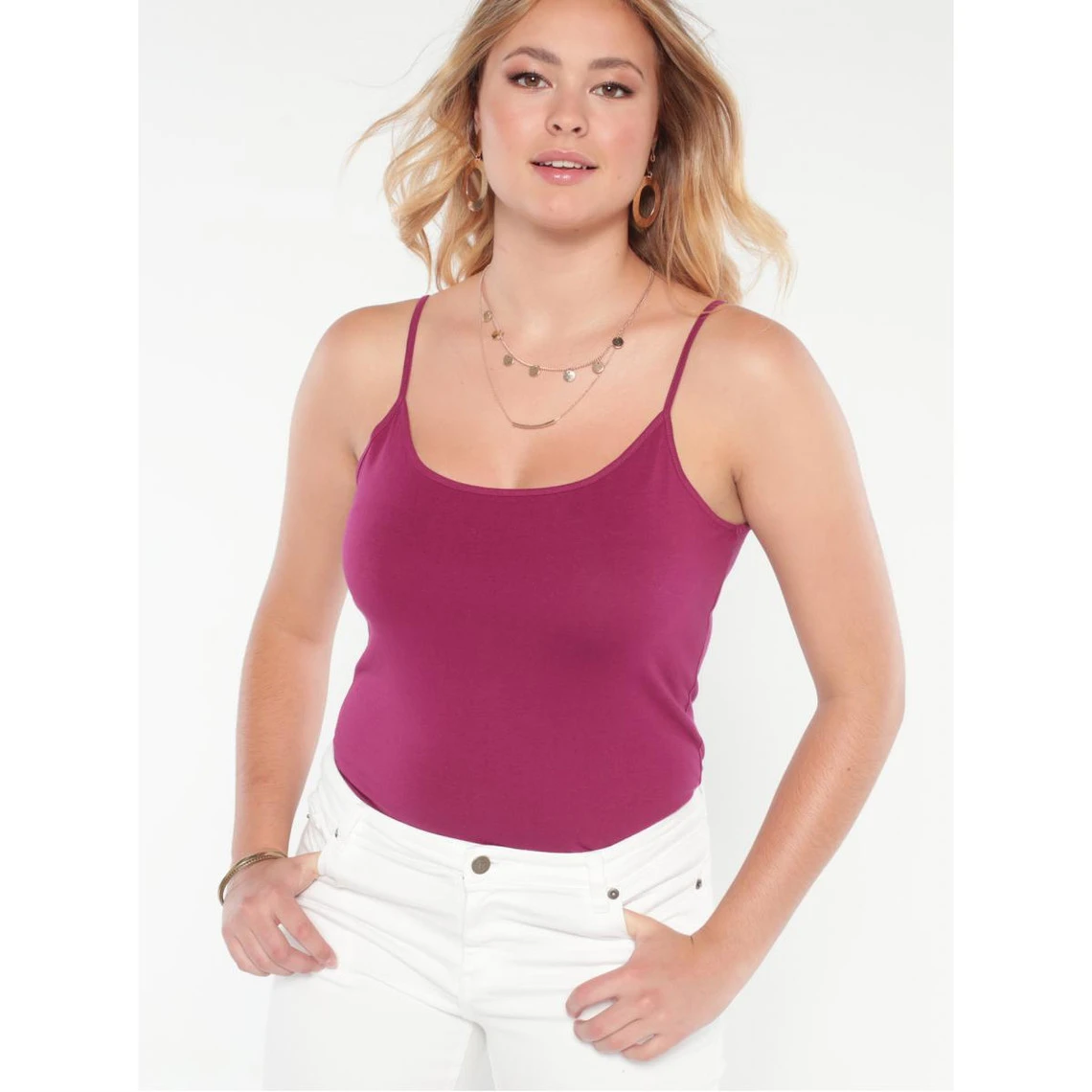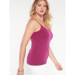 Tee-shirt uni. Encolure arrondie. Fines bretelles. En maille jersey élastique. Longueur 60 cm environ.