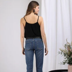 Top à fines bretelles, matière en jacquard léopard, détail dentelle dans le décolleté.