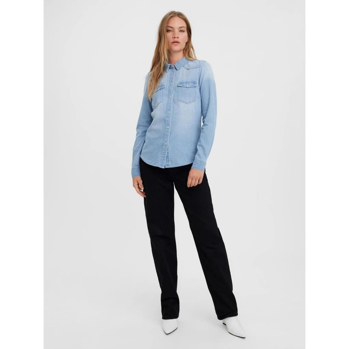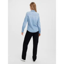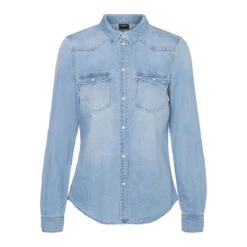 Denim shirt with visible breast pockets, buttoned cuffs, and long sleeves. Style this cool shirt with a pair of jeans for a full denim look. Add heels or sneakers depending on the occasion.